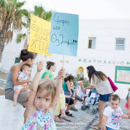 Με αφορμή λοιπόν το παραπάνω περιστατικό και εν όψη της Παγκόσμιας Εβδομάδας Μητρικού Θηλασμού (1-7 Αυγούστου) που διανύουμε (που ας σημειωθεί ότι φέτος έχει σύνθημα: “Υποστήριξη θηλασμού: Κοντά στις μητέρες”), το Πανελλήνιο Δίκτυο Εθελοντικών Ομάδων Υποστήριξης Μητρικού Θηλασμού & Μητρότητας με τη στήριξη του Δικτύου Δράσης για την βρεφική και παιδική διατροφή “IBFAN Ελλάδας”, την περασμένη Δευτέρα 05 Αυγούστου 2013, διοργάνωσαν (έξω από τη ΔΟΥ Θήρας στα Φηρά) εθελοντικό δημόσιο θηλασμός για την προάσπιση του δικαιώματος των παιδιών μας να θηλάζουν όπου και όποτε θέλουν και για την απενοχοποίηση του θηλασμού σε δημόσιους χώρους, με σύνθημα «Έχω δικαίωμα να θηλάζω, όπου και όποτε το έχω ανάγκη».